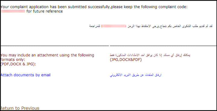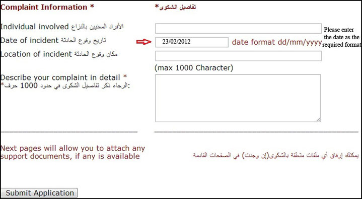 - يرجى تعبئة جميع التفاصيل وذكر تفاصيل الشكوى، ومن ثمّ الضغط على Submit Application.