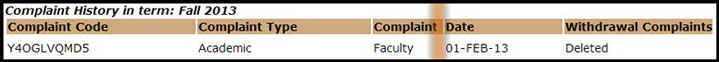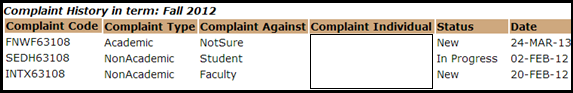 سوف يظهر التقرير التالي والذي يبين رمز الشكوى، ونوع الشكوى، وضد من كانت الشكوى، والأشخاص المعنيين، وحالة الشكوى، وتاريخ وقوع الحادثة، كما هو مبين: