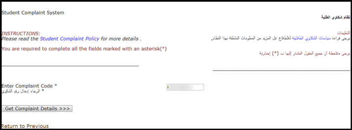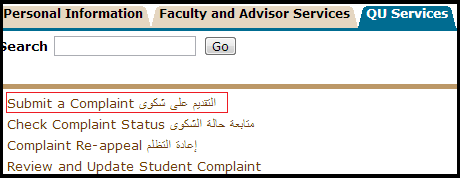 - لمراجعة حالة الشكوى، ادخل على رابط Student Services، والضغط على رابط Complaint System ، ثم قم باختيار استعراض حالة الشكوى Check Complaint Status.