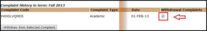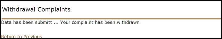 - ى Check Complaint Status ، والذي سوف يظهر التقرير التالي كما هو مبين، قم باختيار المربع في خانة Withdrawal Complaint ثم الضغط على Withdraw from Selected Complaint: