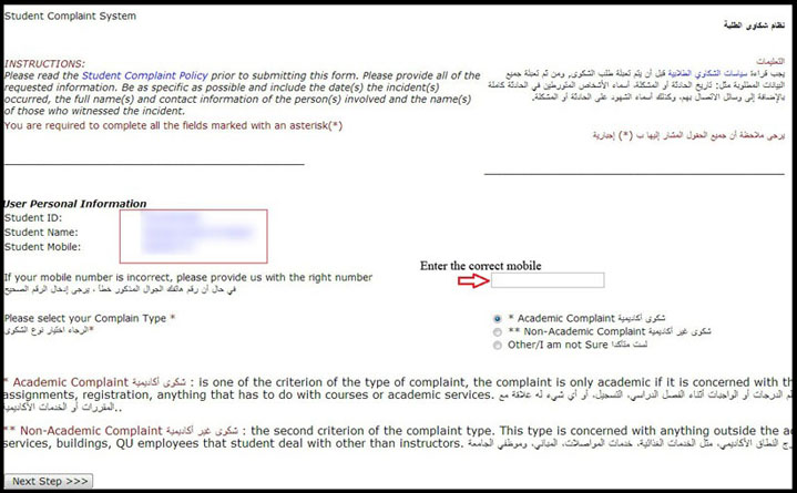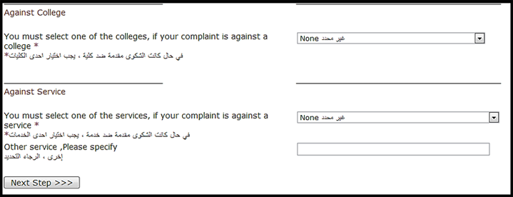 - يرجى اختيار كلية من القائمة إذا كانت الشكوى ضد كلية أو اختيار إحدى الخدمات إذا كانت الشكوى ضد خدمة معينة، ثم الضغط على .Next Step