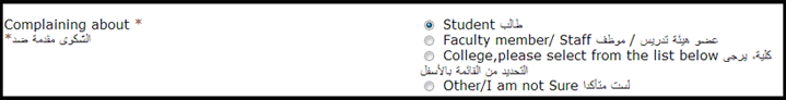 - بعد اختيار نوع الشكوى (أكاديمية أو غير أكاديمية أو لست متأكداً) يجب اختيار أحد العناصر التالية: