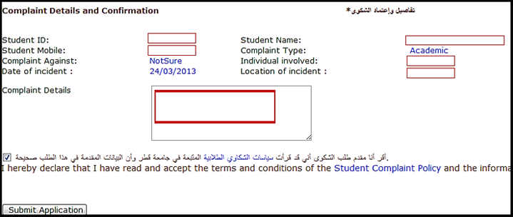 - سوف تظهر الصفحة أدناه، وذلك بتفاصيل الشكوى المقدمة لإعطاء الطالب فرصة أخيرة لتعديل تفاصيل الشكوى، يجب الإقرار بقراءة سياسات الشكاوى الطلابية حتى يتسنى للطالب استكمال التقديم، كما هو مبين أدناه، ومن ثمّ الضغط على Submit Application.