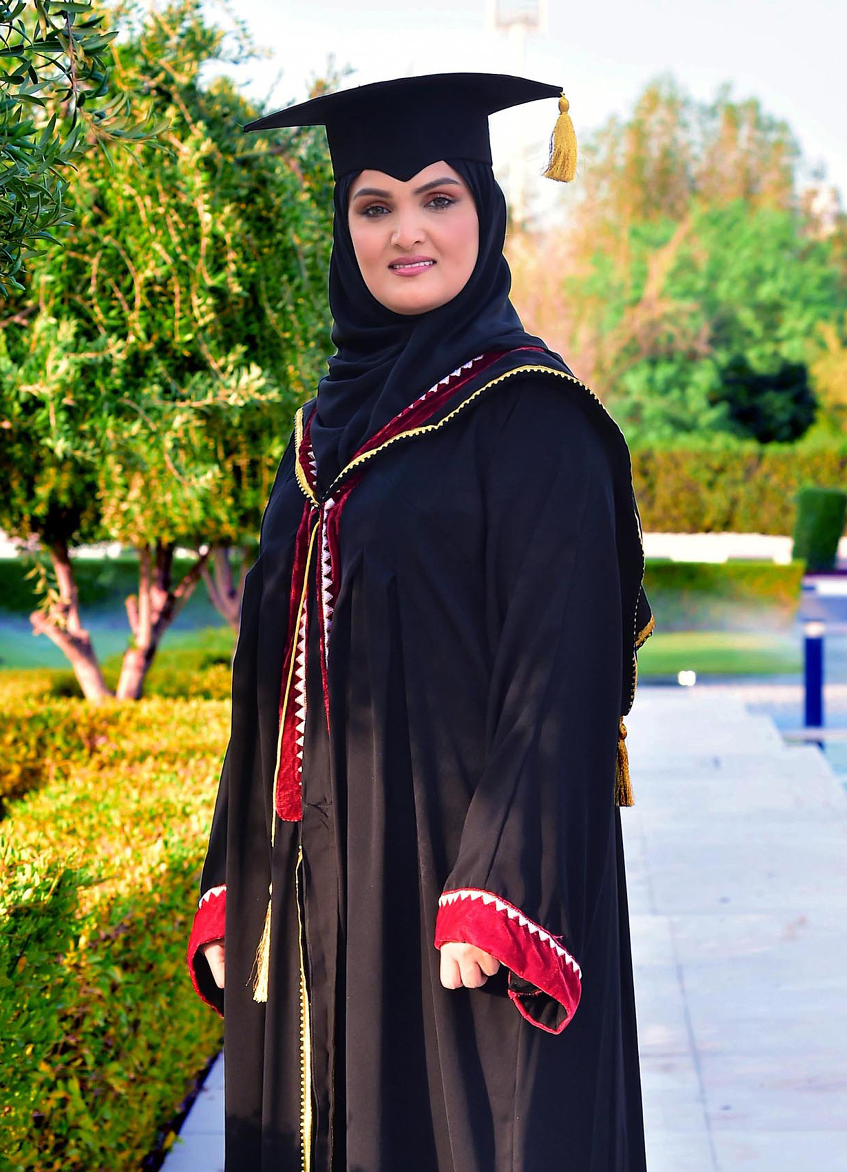 The graduation gown has been designed to combine both originality and Qatar's heritage, and features the traditional graduation gown which consists of a black gown and a black quadrangular cap. The gown cost is QR150.