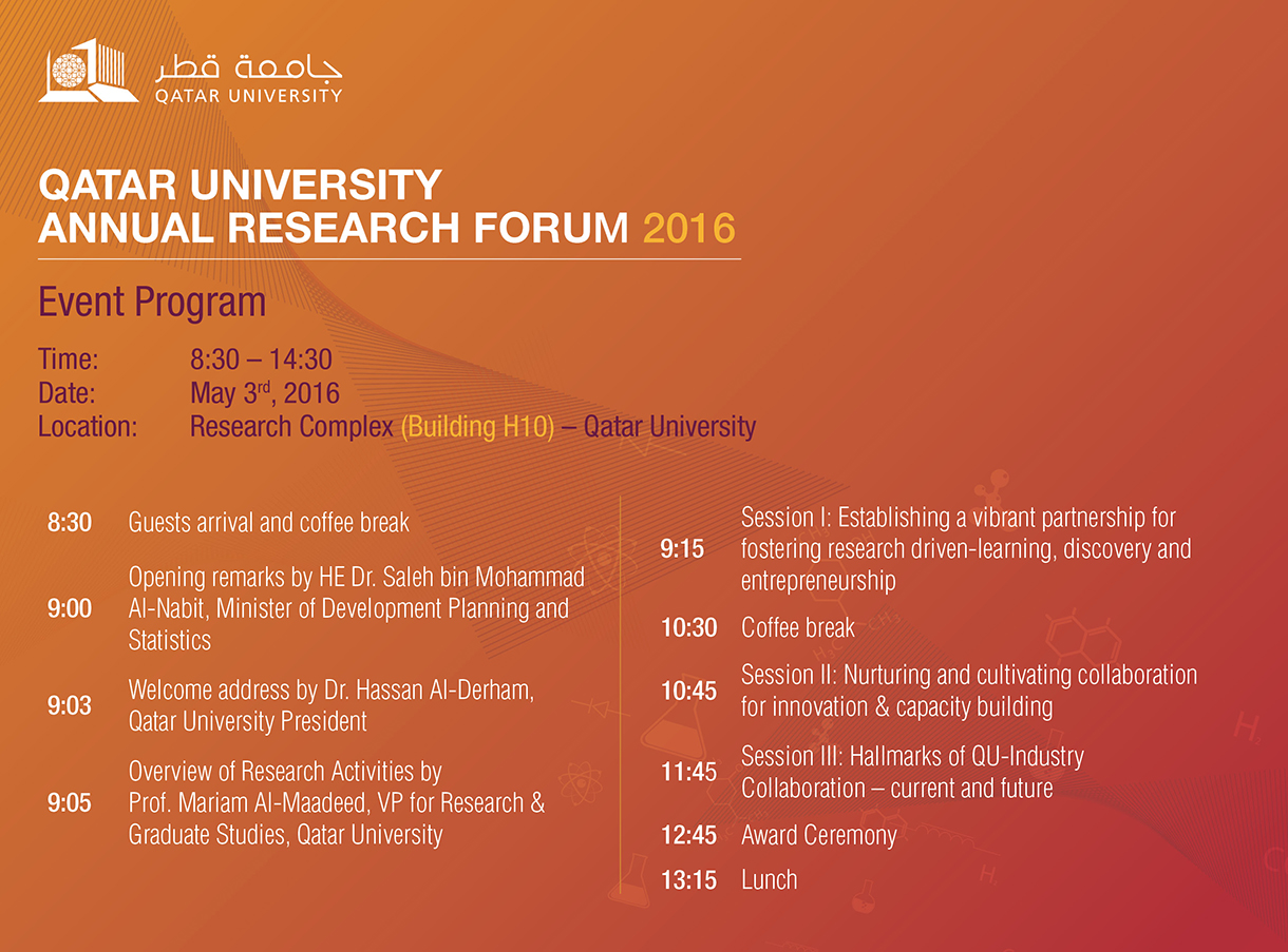 QUARF '16 is an occasion to present original research, demonstrate new tools, or report on the implementation of new programs, collaborations, innovations and other relevant projects that take bearing from the QU Research Roadmap, Qatar National Research Strategy and Qatar National Vision 2030.